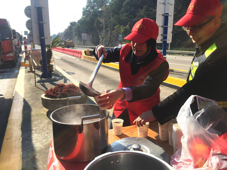 圖為工作人員在備熱飲品 當天是入冬以來最冷的一天,收費崗亭周圍氣溫達到零下4度。該所員工身穿耀眼的“紅馬甲”,面帶微笑,在車道安全島內(nèi)搭起臨時“便民服務(wù)臺”,頂著嚴寒為過往司乘人員遞上一杯杯滾燙的姜茶與紅豆湯,并提醒司機朋友天冷注意保暖。 “姜茶暖我身、服務(wù)心貼心??!”一位司機師傅接過姜茶不由地詩意起來。 “你們服務(wù)態(tài)度真好,有禮貌,充滿熱情,這么冷的天,能有一杯熱水是多么幸福的事情??!”另一位司機朋友一臉笑意地稱贊道。 他們的友好回應(yīng)讓員工們忘了寒冷,也給了大家提供更貼心服務(wù)的動力。