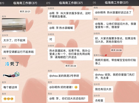 “太冷了,崗亭空調(diào)全都運行不起來了?!?/span> “每個崗亭都一樣。” “冷死啦!” “修空調(diào)的師傅來了,檢查了一下,他說這個沒辦法,是因為天氣太冷的原因,并不是壞了?!?/span> “大家衣服趕緊多穿點,誰有舊的工作大衣。” “熱水袋灌起來,不夠,我的拿去先用。” “我也有舊大衣?!?/span>
