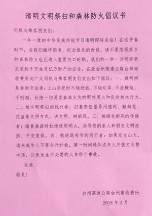 圖為倡議書 為增強(qiáng)防火意識(shí),做到文明祭掃,3月16日上午,臺(tái)州南收費(fèi)所在向過往司乘人員發(fā)放《清明文明祭掃和森林防火倡議書》,倡議大家做明辨是非的守法者:不燒紙錢、不放鞭炮、杜絕野外用火和亂伐林木行為;做文明祭掃的踐行者:提倡用植樹、獻(xiàn)鮮花、花籃等方式祭祖;做綠色新風(fēng)的傳遞者:勸導(dǎo)家人和朋友文明出游;做進(jìn)退有節(jié)的同行者:發(fā)生山火,理智救火。
