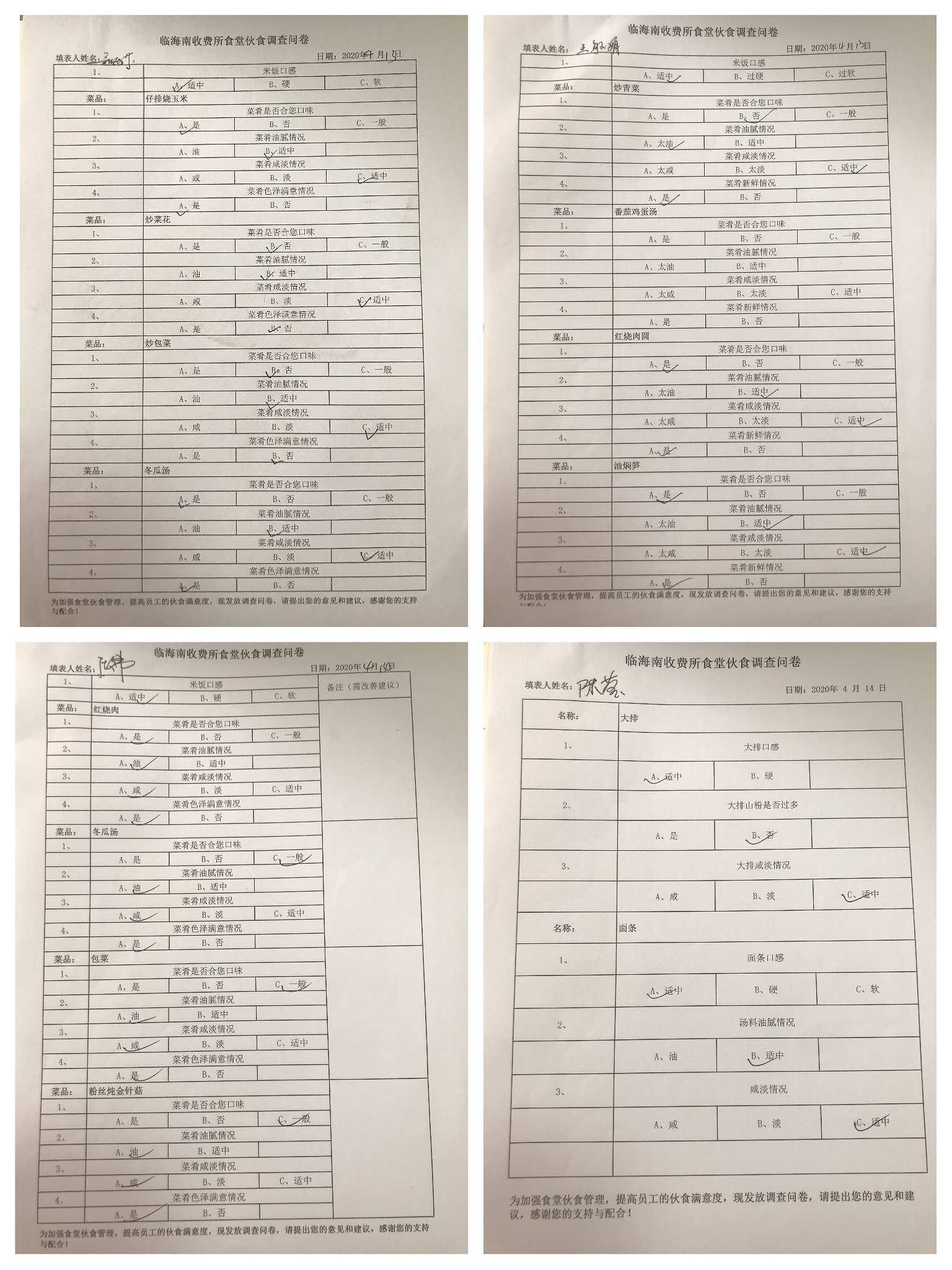 圖為伙食調(diào)查表 為了提高食堂滿意度,該所從菜肴口味、油膩度、咸淡、色澤等方面制定調(diào)查問卷,讓大家真實客觀地表達各自的想法和建議。問卷調(diào)查采用當(dāng)班用餐人員實名填寫問卷調(diào)查表的形式進行,通過收集的問卷,每天中午定期召集食堂人員,反饋前一天的調(diào)查結(jié)果,根據(jù)員工的反饋建議,討論制定整改措施,確保將員工的意見及建議落到實處。除此之外,每逢傳統(tǒng)佳節(jié),定制相應(yīng)的節(jié)日菜譜,保證員工在站所也能感受到節(jié)日的喜慶和家的溫馨。 通過一個月的實施反饋來看,總體結(jié)果比較滿意。兩位廚師也都表示,今后要努力改善菜肴質(zhì)量和服務(wù)水平,嚴把食堂飲食安全關(guān),提高食堂各項工作的質(zhì)量,經(jīng)常性地與員工溝通,力爭讓每位員工滿意,做員工放心食堂。