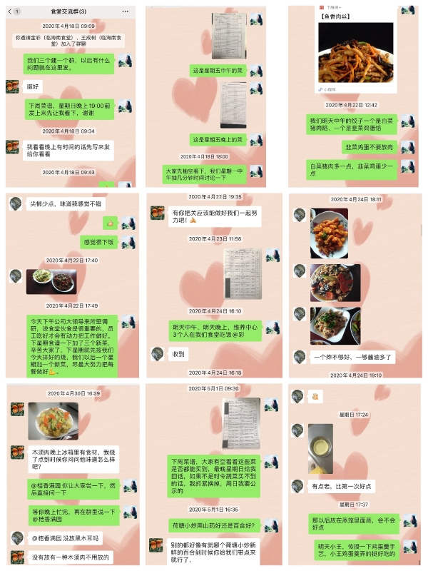 圖為建立食堂交流群 今年4月中旬,所務(wù)陳瑩利用微信建立了食堂交流群,經(jīng)常在群里上傳從網(wǎng)上、廚房APP上下載的一些簡單又美味的家常菜制作方法。并結(jié)合食堂人員的特長,針對季節(jié)變換,合理調(diào)整飲食,做到葷素搭配、飯菜每班一日三餐不重樣等要求,提前列出每周菜譜,要求食堂人員根據(jù)菜譜,每周針對創(chuàng)新家常菜,提前準備少量食材,精心燒制,待嘗試滿意后再供應(yīng)。
