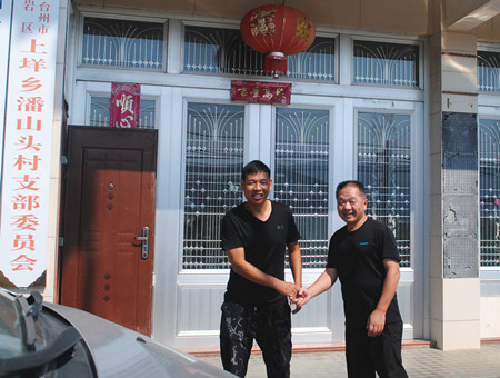 圖為公司黨群部負(fù)責(zé)人邵克與潘山頭村村長(zhǎng)親切握手