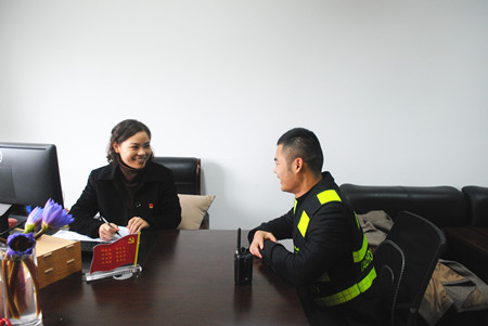 圖為臺(tái)州收費(fèi)所所長(zhǎng)助理牟妲與二班班長(zhǎng)馬德偵談心