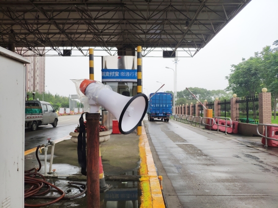 圖為入口處放置的語音警報小喇叭 在嚴(yán)把入口關(guān)中,該所要求入口必須有人員在崗,履行“一崗雙職”的重任,時刻關(guān)注入口情況,及時發(fā)現(xiàn)并勸阻違規(guī)車輛和人員的進(jìn)入。此外,入口顯眼處懸掛“請珍愛生命,禁止行人和非機(jī)動車上高速”的警示標(biāo)語。入口處增添放置的管控小助手---語音警報器,循環(huán)播放普通話和方言警示標(biāo)語:“行人、自行車、摩托車禁止上高速公路”。入口安全島頭和邊溝處放置水碼,防止行人、摩托車、電動車和自行車從邊溝處和超寬車道進(jìn)入高速。而由維養(yǎng)中心人員在入口高處安裝的攝像裝置,只要行人、自行車等非機(jī)動車輛出現(xiàn)在攝像范圍內(nèi),就會立刻傳來“警戒區(qū)域,請盡快離開”的持續(xù)性警報聲。在人員的管控和設(shè)備的警示下,收費(fèi)所入口安全不斷地提升。