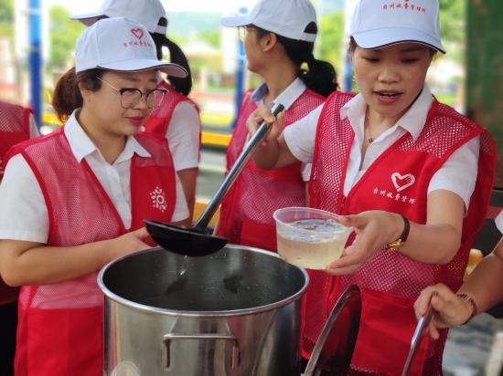 圖為志愿者合影 上午9點,志愿者們身著統(tǒng)一紅馬甲,在崗?fù)さ陌踩珝u上設(shè)立服務(wù)臺,抬出食堂提前制作好的青草糊、綠豆湯等清涼飲品。你來分杯我來送,大家不亦樂乎開始了送清涼活動。