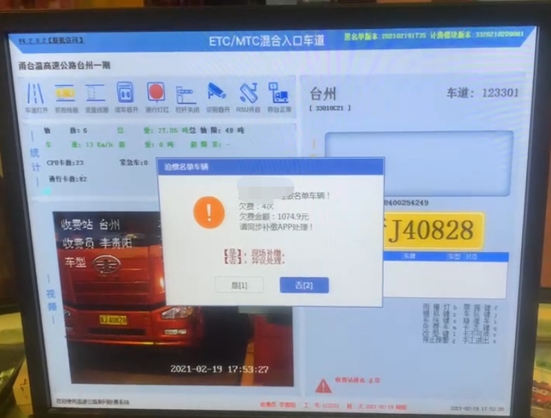 自取消省界收費站全國高速公路聯(lián)網(wǎng)后,跨省追繳通行費一直是個大難題,不少司機的省外通行費因無法追繳,造成通行費不斷流失。交通部為了適應“全國一張網(wǎng)”稽核業(yè)務工作需要,確保各收費站現(xiàn)場有序處理追繳名單車輛,避免造成社會輿情和人身財產(chǎn)安全事件,研發(fā)了全國稽核通行費補費系統(tǒng)。 2月19日晚17點50分左右,臺州收費所進口迎來一輛車牌為浙J開頭的六類貨車,車道屏幕顯示為“浙J XXXXXX追繳名單車輛,欠費4次,欠費金額1074.9元,請同步補繳APP處理?!碑敯嗍召M員見此詢問駕駛員是否欠費,并喊來當班班長張錚過來處理。