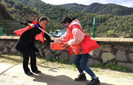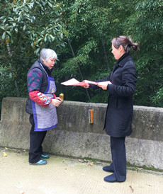 圖為女職工向當(dāng)?shù)乩先诵麄髑迕魑拿骷罀?/span> 然而,女職工們卻不“安分守己”,以這樣的方式來慶祝自己的節(jié)日:她們兵分二路,一路擔(dān)起森林防火宣傳員,向過往群眾發(fā)放《清明文明祭掃和森林防火倡議書》,并對上了年紀的村民耐心講解倡議書內(nèi)容,將臺州高速的文明服務(wù)從工作中延伸到了生活中。一路環(huán)繞水庫去清理其邊上的垃圾,一上午下來,收獲還真不少,共清理廢紙、飲料罐、塑料袋等廢棄物若干袋,在打造“生態(tài)文明”中率先垂范,擔(dān)其責(zé),盡其力。
