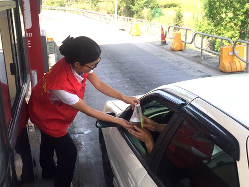 8月10日,臺州南收費所的部分黨員、團員一大早就來到所里,將綠豆紅棗湯、涼粉等消暑物品分杯、添糖、加水、封口,為一年一次的“送清涼”活動作準備?!八颓鍥觥被顒邮窃撍驹刚叻贞牱丈鐣膬?nèi)容之一,是臺州高速的一道風景。