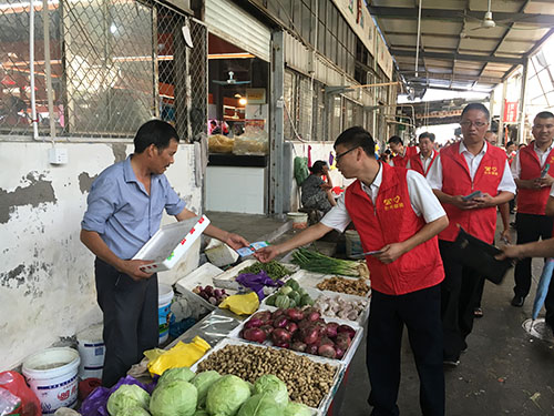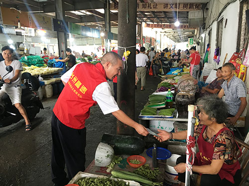圖為志愿者在菜場(chǎng)宣傳垃圾分類 志愿者們特地選取菜市場(chǎng)、商鋪等人多且容易產(chǎn)生垃圾的地方,向店主和商販們宣講環(huán)境公害引發(fā)的負(fù)面后果及如何處理平時(shí)的生活垃圾,他們結(jié)合宣傳冊(cè)通俗、耐心地講解生活垃圾要從源頭開(kāi)始分類投放:干濕要分開(kāi),對(duì)剩菜剩飯、瓜皮果殼等易腐垃圾要瀝干水分,投放后要蓋好垃圾桶,免得蚊蠅滋生;紙類、飲料瓶、金屬等有再生利用價(jià)值的要放在可回收的垃圾桶里;對(duì)電池、電子產(chǎn)品、殺蟲(chóng)劑、油漆桶等含有害化學(xué)物質(zhì)的要單獨(dú)放;剩余的作其它垃圾處理。