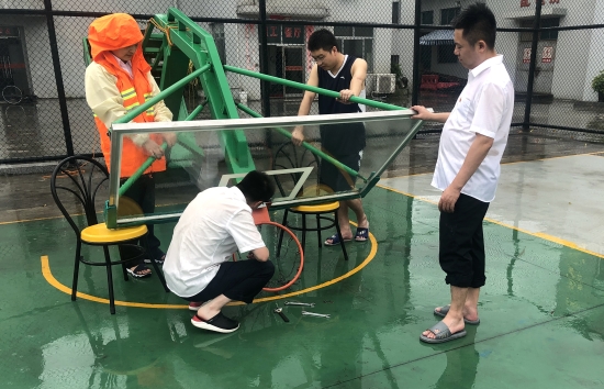 圖為所負(fù)責(zé)人帶領(lǐng)人員拆卸籃球架 此前,溫嶺西已經(jīng)做好基礎(chǔ)的抗臺防范工作,關(guān)閉所內(nèi)各寢室、辦公室門窗,提前裝好沙袋備用,準(zhǔn)備好抗臺物資及近幾天的餐食,確保所內(nèi)各項事務(wù)正常運行。8月9日上午,該所長、副所長在臺風(fēng)前做最后一次細(xì)致的排查,三人還親自動手將陽光房的窗戶都卸下來,避免風(fēng)力太大,玻璃破裂,造成安全隱患。此外,為預(yù)防操場籃球架承受不住巨大風(fēng)力,將籃球框拆卸下來,把籃球架放倒。其后通知所內(nèi)開車的人員將所有車輛停入操場中,以防止周邊樹木被風(fēng)刮斷,造成車輛損失。 林夢灑