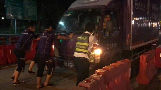 圖為收費員幫助司機將故障車輛推出車道 8月15日凌晨1點多,溫嶺西收費所征費二班安全員在日常巡邏時發(fā)現(xiàn)一輛小型貨車停在進口內(nèi)廣場,在詢問司機后得知車輛因出現(xiàn)故障導致無法發(fā)動。安全員當即叫來旁站人員,與兩個司乘人員一起用力,慢慢地將該車推出車道。在婉拒了司機遞香煙的好意后,安全員囑咐司機盡快聯(lián)系人員前來解決,后回到崗位繼續(xù)工作。