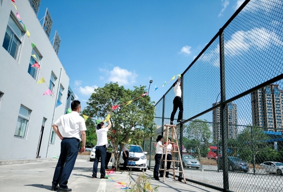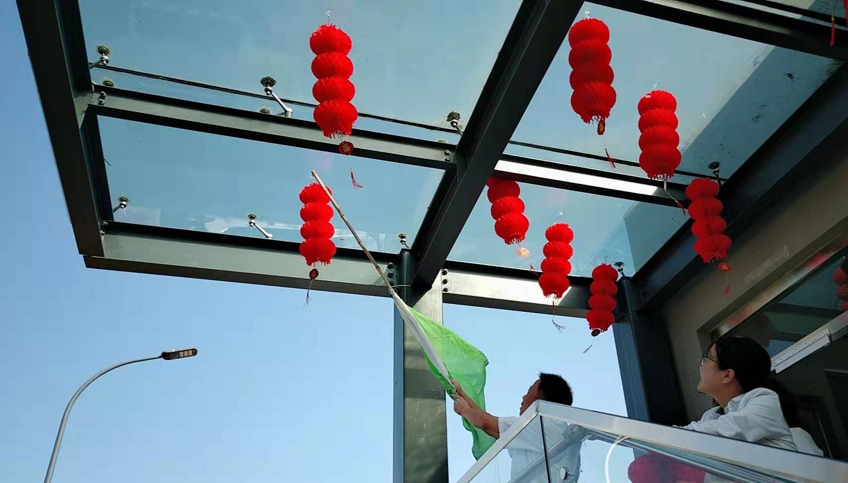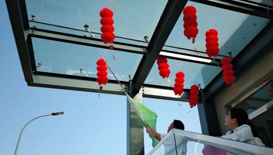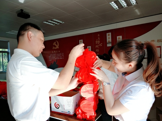 圖為工作人員一起布置收費所 在慶祝祖國70周年生日的日子里,最火的顏色就是紅色。為了弘揚中華民族傳統(tǒng)文化,溫嶺西收費所后勤組早早購置了燈籠、彩旗、五星紅旗,寫好“慶祝祖國70周年華誕”大字等。黨員帶頭,團員緊跟,一線收費員紛紛參與,在收費站大門口、辦公樓、食堂、宿舍等區(qū)域精心用五星紅旗、大紅燈籠、五顏六色的彩旗裝點,一抹抹艷麗的國旗紅,成為站點最靚麗的風(fēng)景。明亮的黃、鮮艷的紅,美麗窗口突然亮了起來,到處洋溢著濃濃的國慶氛圍,為過往司乘提供暢、潔、美的節(jié)日行車環(huán)境。 溫嶺西收費所后勤組還精心策劃、精細(xì)編排,制作了具有特色、獨具創(chuàng)意的生日祝福“小視頻”,祝祖國生日快樂! 通過開展弘揚愛國精神,喜迎國慶活動,溫嶺西收費所全所工作人員更加不忘初心,砥礪前行,共同慶祝祖國70周年華誕。 鄭霞霞