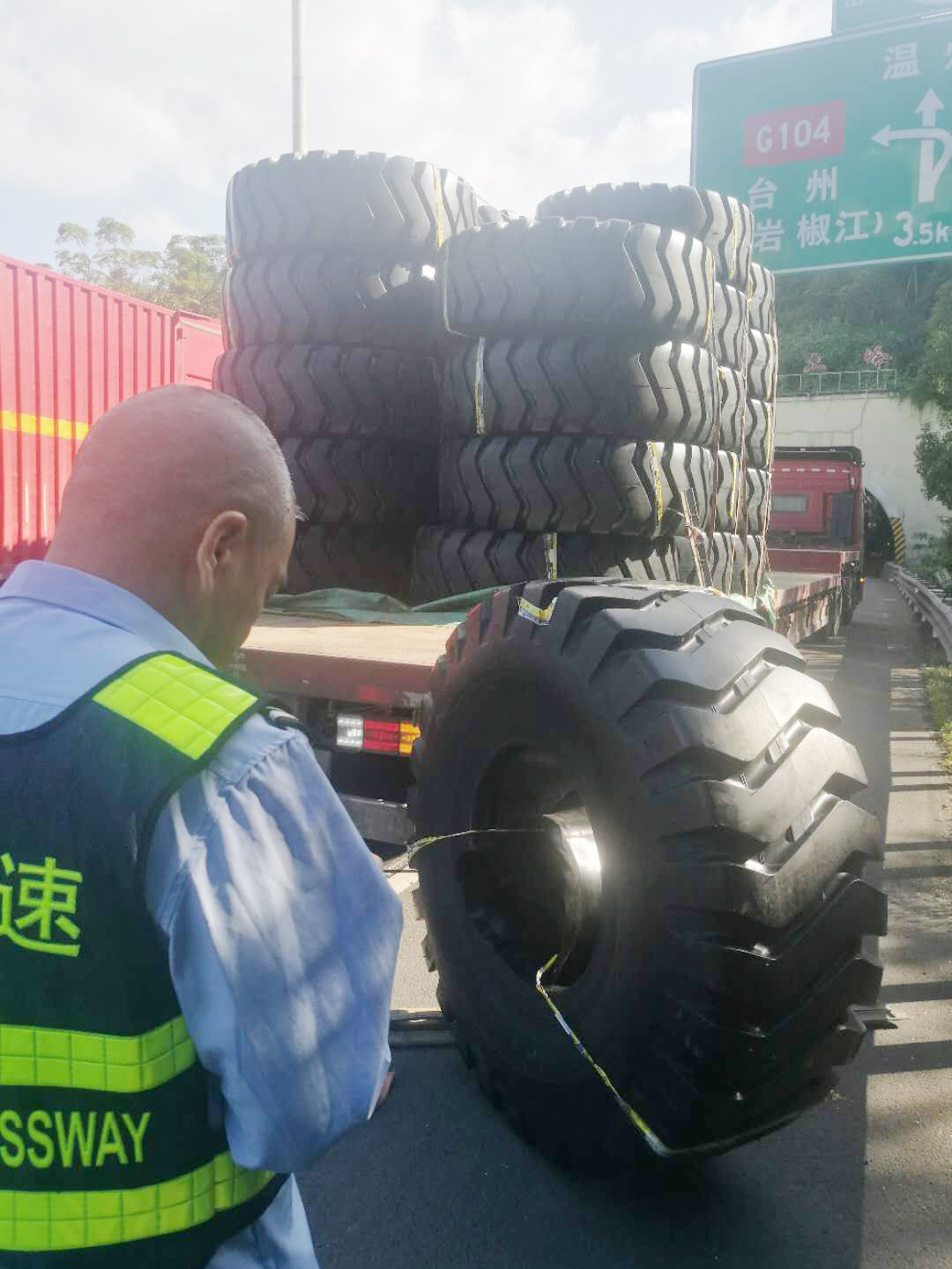 執(zhí)勤隊(duì)接警后立即趕往事故地點(diǎn),一輛運(yùn)載輪胎的貨車??吭谥鬈嚨溃渲幸粋€(gè)巨型輪胎滑落到硬路肩上,致使后方車輛紛紛避讓。為及時(shí)消除險(xiǎn)情,執(zhí)勤隊(duì)快速在現(xiàn)場(chǎng)做好安全警戒工作,同時(shí)將現(xiàn)場(chǎng)情況反饋給監(jiān)控中心。由于貨車綁繩索松動(dòng),重達(dá)300多斤的輪胎脫落在地,隨后執(zhí)勤隊(duì)協(xié)同施救中心、駕駛?cè)?/span>員合力將掉落的輪胎先拖至車旁,經(jīng)過長(zhǎng)達(dá)半個(gè)小時(shí)的搶險(xiǎn),跌落的貨物終于完好無缺地回到貨車上,道路恢復(fù)暢通。 筆者溫馨提醒:在高速公路行駛過程中,駕駛?cè)藨?yīng)注意將車上的貨物固定好,途中要隨時(shí)注意貨物及捆綁繩索是否松動(dòng)。無論是車輛撒落物還是人為拋灑物,都會(huì)給道路安全暢通埋下了重大隱患! 林玲