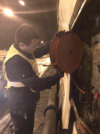 圖為檢查人員在檢查消防卷盤 大溪嶺隧道所負責(zé)人向來客介紹,隧道清洗工作需集團下屬的施救中心、維養(yǎng)中心、隧道所員工,以及外協(xié)單位、養(yǎng)護公司等人員的積極配合,分工合作,將利用兩天時間完成大溪嶺雙向隧道的清洗維修任務(wù)。張金財再次稱贊表示,控制隧道清洗時間能有效地緩解地方交通壓力、節(jié)能減排。 2018年度春運即將開始,各方檢查人員借此次隧道清洗機會,全面排查影響隧道暢通的安全隱患,做好隧道內(nèi)設(shè)備設(shè)施的維修保養(yǎng)工作,為創(chuàng)造平安節(jié)日提供保障。 陳智慧