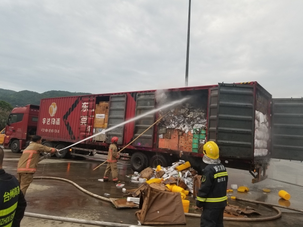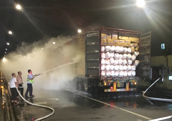 萬幸的是,恰逢溫州高速交警巡邏車經(jīng)過,隨即在該貨車后方預(yù)警,很快的所巡邏車、消防車先后到達(dá)現(xiàn)場協(xié)同滅火。由于該車貨物較多,且裝載物皆為紙箱和塑料,集裝箱底層溫度較高,一時(shí)只能將明火撲滅,但車廂內(nèi)仍有大量煙霧,為了安全,車子必須盡快撤離隧道,執(zhí)勤隊(duì)當(dāng)即決定讓駕駛員把車開往南廣場繼續(xù)滅火,消防車則一路緊隨其后滅火,以防火勢變大。