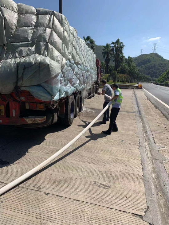 圖為消滅隱患現(xiàn)場(chǎng) 同時(shí),中控員密切關(guān)注車(chē)輛動(dòng)向,13:37,中控員在隧道南廣場(chǎng)發(fā)現(xiàn)該車(chē),巡邏車(chē)立即奔赴現(xiàn)場(chǎng),該車(chē)后輪胎剎車(chē)位置在冒煙,司機(jī)正用礦泉水澆輪胎,隊(duì)員們見(jiàn)狀,火速上前把消防栓打開(kāi),接上消防水帶,交與該車(chē)司機(jī),托著消防水帶,對(duì)準(zhǔn)輪胎接連猛射,冷卻剎車(chē)片,輪胎終于沒(méi)有冒煙,一場(chǎng)隱患被隊(duì)員消除了。 據(jù)悉,該輛半掛車(chē)因輪胎爆炸,引起冒煙,司機(jī)卻想著從下一個(gè)高速出口,幸好隊(duì)員們監(jiān)控及時(shí),出警迅速,施救到位,把隱患扼殺在搖籃里,沒(méi)在隧道內(nèi)發(fā)生火災(zāi),不然后果將無(wú)法想象。 現(xiàn)場(chǎng),隊(duì)長(zhǎng)告知司機(jī),萬(wàn)一車(chē)輛發(fā)生火災(zāi),請(qǐng)把車(chē)停在隧道外,若在隧道內(nèi)發(fā)現(xiàn)車(chē)輛起火,請(qǐng)加速駛往隧道口,盡快駛離隧道,避免造成人員傷亡。 陳智慧
