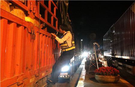 夜間綠農車輛多,據統(tǒng)計,當天凌晨早班臨海南收費所出口綠農車108輛,是平時日均數(shù)量的八九倍。短時間內的“井噴式”增長,這又是一個大考驗?!叭柧G色”、“一號綠色”、“二號綠色”……“來啦!”旁站人員箭步沖過去拍照取證、檢查車輛。大貨車又高又寬,平時需登專用扶梯進行檢查,可在大流量面前保安全省時間是第一要旨,這些個巾幗女將們面對高貨車,一手拉著車把,一腳踩在車杠上,迅速上車開展核查,執(zhí)行速度絲毫不遜于男同志。有時剛從這輛貨車上下來,又立刻奔向了其它車道。晴夜當空,車道間一個個忙碌的身影不停穿梭著,卻不言乏力。