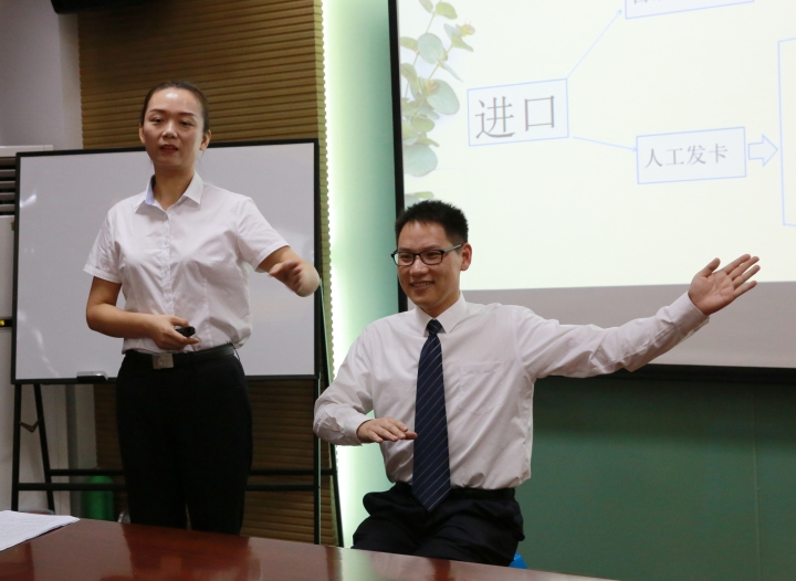 隨后,臨海南收費(fèi)所文明服務(wù)培訓(xùn)師徐蘇蘇通過PPT,以輕松風(fēng)趣的講課風(fēng)格,給班子領(lǐng)導(dǎo)們上了一堂儀容儀表講解、操作流程演示、文明服務(wù)動(dòng)作以及心理建設(shè)的課,并通過員工真人示范文明服務(wù)中坐姿、眼神、聲音等練習(xí),令在場的受訓(xùn)者耳目一新。