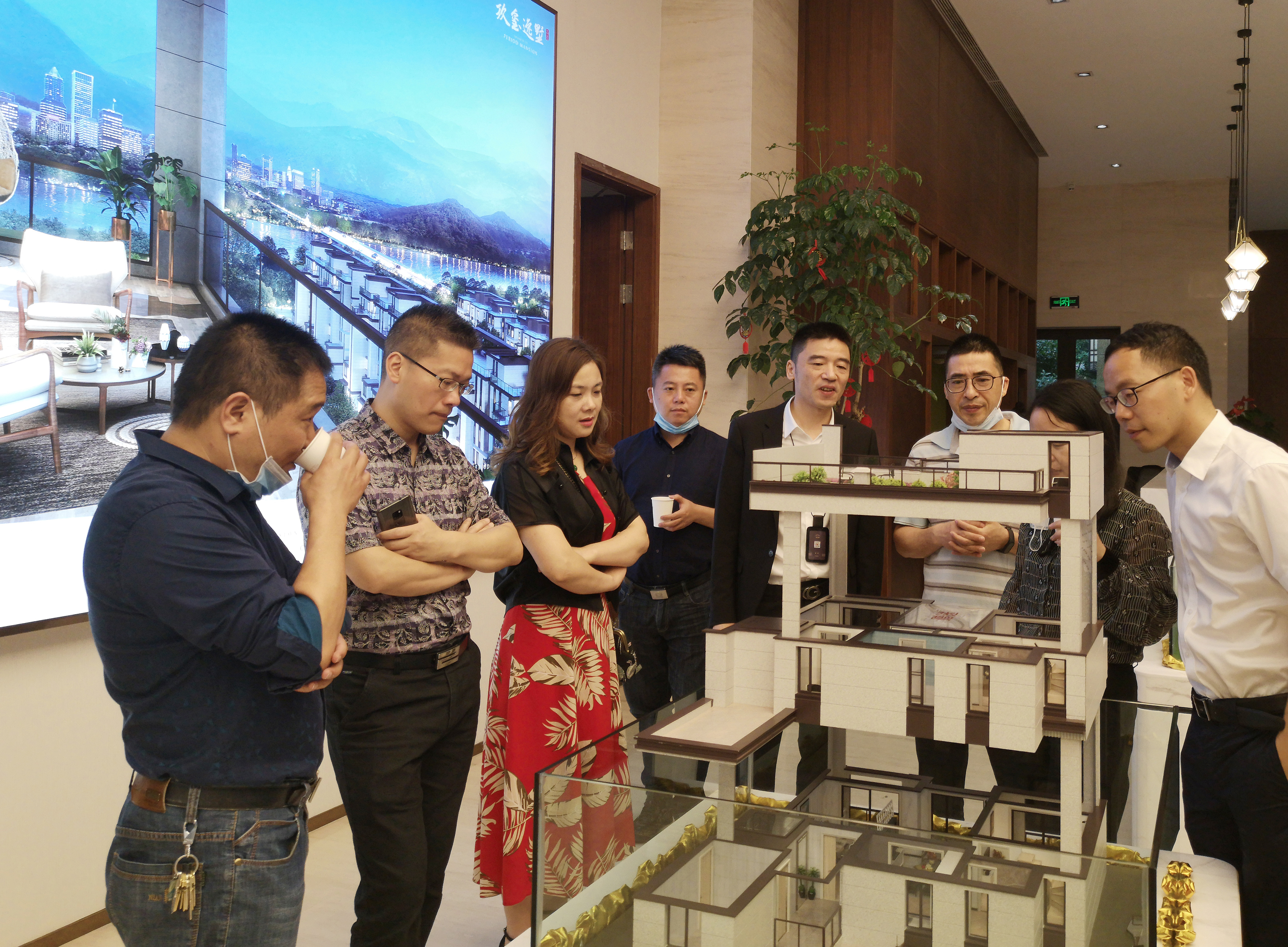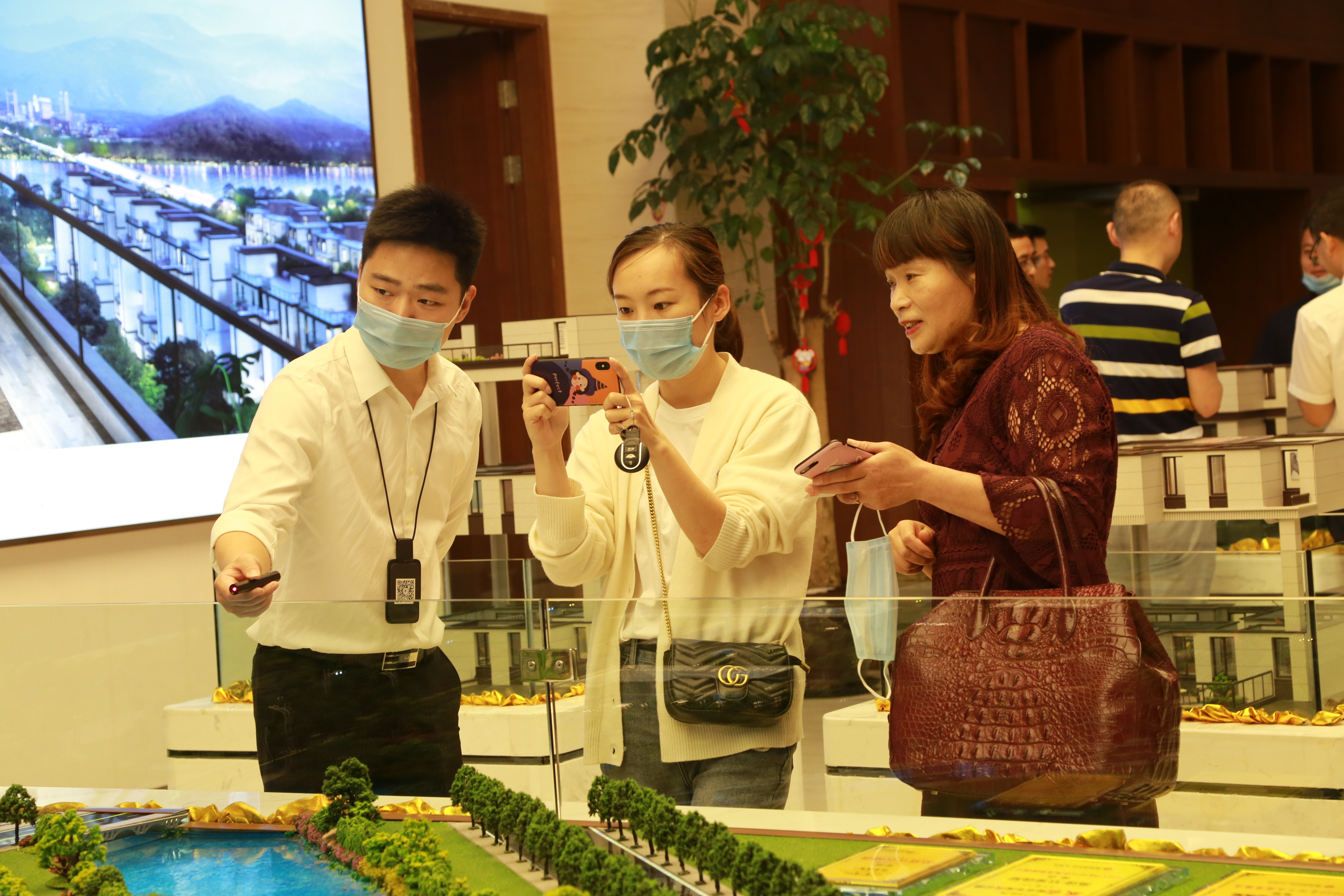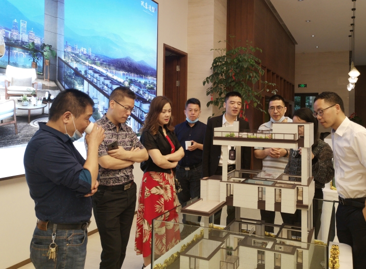 圖為陳文波對(duì)照?qǐng)D紙了解樓盤(pán)情況 在銷(xiāo)售展廳樓盤(pán)沙盤(pán)前,陳文波聽(tīng)取了高速房產(chǎn)(集團(tuán))公司負(fù)責(zé)人關(guān)于玖璽逸墅項(xiàng)目銷(xiāo)售計(jì)劃、認(rèn)籌客戶等情況匯報(bào)。他對(duì)前期房產(chǎn)公司的辛苦付出給予充分肯定,要求大家認(rèn)真服務(wù)好每一個(gè)來(lái)訪客戶,彰顯出國(guó)企品質(zhì),全力做好銷(xiāo)售工作。 當(dāng)天,銷(xiāo)售展廳樓內(nèi),陸陸續(xù)續(xù)有客戶進(jìn)出,“我很早就看中這個(gè)樓盤(pán)了,不僅位置好,而且采光好、通風(fēng)好,居住在這里一定非常舒服?!币幻麥?zhǔn)客戶張女士夸贊道,今天她特意前來(lái)交付認(rèn)籌金。  圖為客戶在疊墅沙盤(pán)前參觀