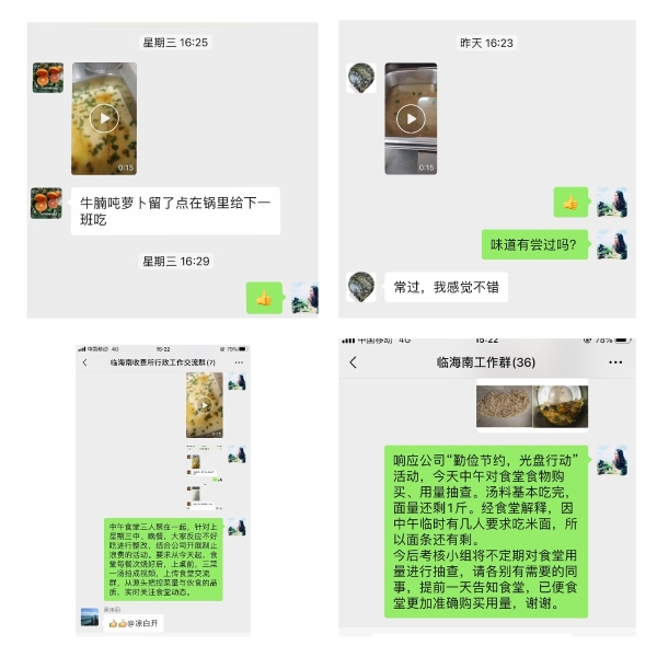 臨海南收費所不只是單單把宣傳標語掛在墻上,擺在桌上。更把節(jié)約舉措落實到具體行動中。為了不浪費食材,行政人員提前安排一周菜單,并統(tǒng)計用餐人數(shù),規(guī)劃食材數(shù)量,食堂工作人員按照人數(shù)采購當(dāng)天食材控制成本,并將每餐燒好的菜拍成視頻上傳食堂交流群,以更好地關(guān)注食堂動態(tài),從源頭把控菜量與伙食的品質(zhì),每周還不定期抽查食堂,查看剩余量。