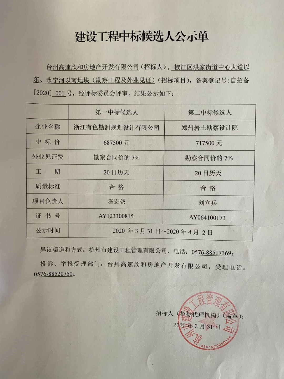 椒江區(qū)洪家街道中心大道以東、永寧河以南地塊(勘察工程及外業(yè)見證)(招標項目)中標候選人公示單