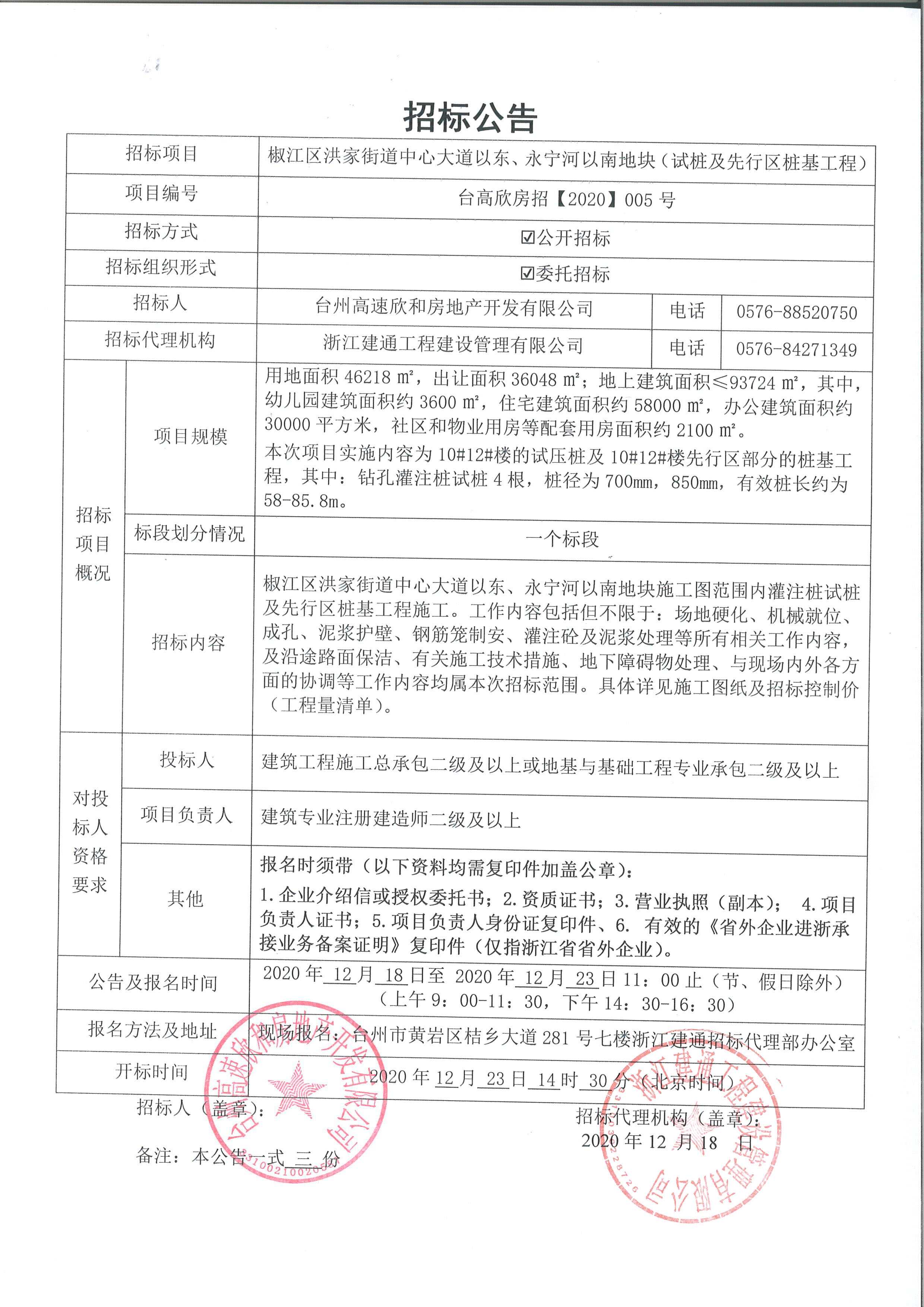 椒江區(qū)洪家街道中心大道以東、永寧河以南地塊(試樁及先行區(qū)樁基工程)招標公告
