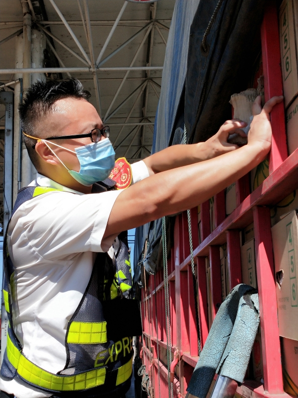 檢查綠農(nóng)車,遇到攀爬驗(yàn)貨時(shí),車輛欄桿因高溫炙烤至少在四五十度以上,臺(tái)州南收費(fèi)所班長(zhǎng)周冬子笑著說(shuō):“現(xiàn)在的車欄桿都‘辣手’了,腳底板也像踩了‘風(fēng)火輪’。” 話音還未落,只見他蹭蹭幾下,已然爬上貨車,一邊檢查貨物一邊用袖子蹭掉臉上豆大的汗珠,被曬得黝黑發(fā)紅的皮膚在烈日下格外醒目。綠農(nóng)車開走后,他顧不上滿身汗水,拿起了掃把開始打掃灑落在車道上的綠農(nóng)產(chǎn)品。因?yàn)樗?,這些灑落的農(nóng)產(chǎn)品,如不及時(shí)清理,在太陽(yáng)曝曬后將會(huì)更加刺鼻,影響收費(fèi)站的形象。 熱浪滾滾,卷不走收費(fèi)員們工作的熱情;夏日炎炎,燃不盡收費(fèi)員們堅(jiān)守的意志。他們用執(zhí)著在高溫下書寫愛崗敬業(yè),用責(zé)任和擔(dān)當(dāng)保障著高速的平安暢通。 項(xiàng)丹穎