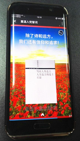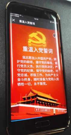 “凝視黨旗,我把奉獻(xiàn)刻心里;舉起右拳,我把責(zé)任刻心里;宣讀誓言見證我對(duì)黨的忠誠(chéng);這崇高的選擇是我終身的信仰----”點(diǎn)開微信圖文信息,伴隨著低沉渾厚的男聲詩(shī)朗誦,接收到信息的黨員們不由肅然起敬,仿佛置身當(dāng)年黨旗下宣誓的莊嚴(yán)時(shí)刻。