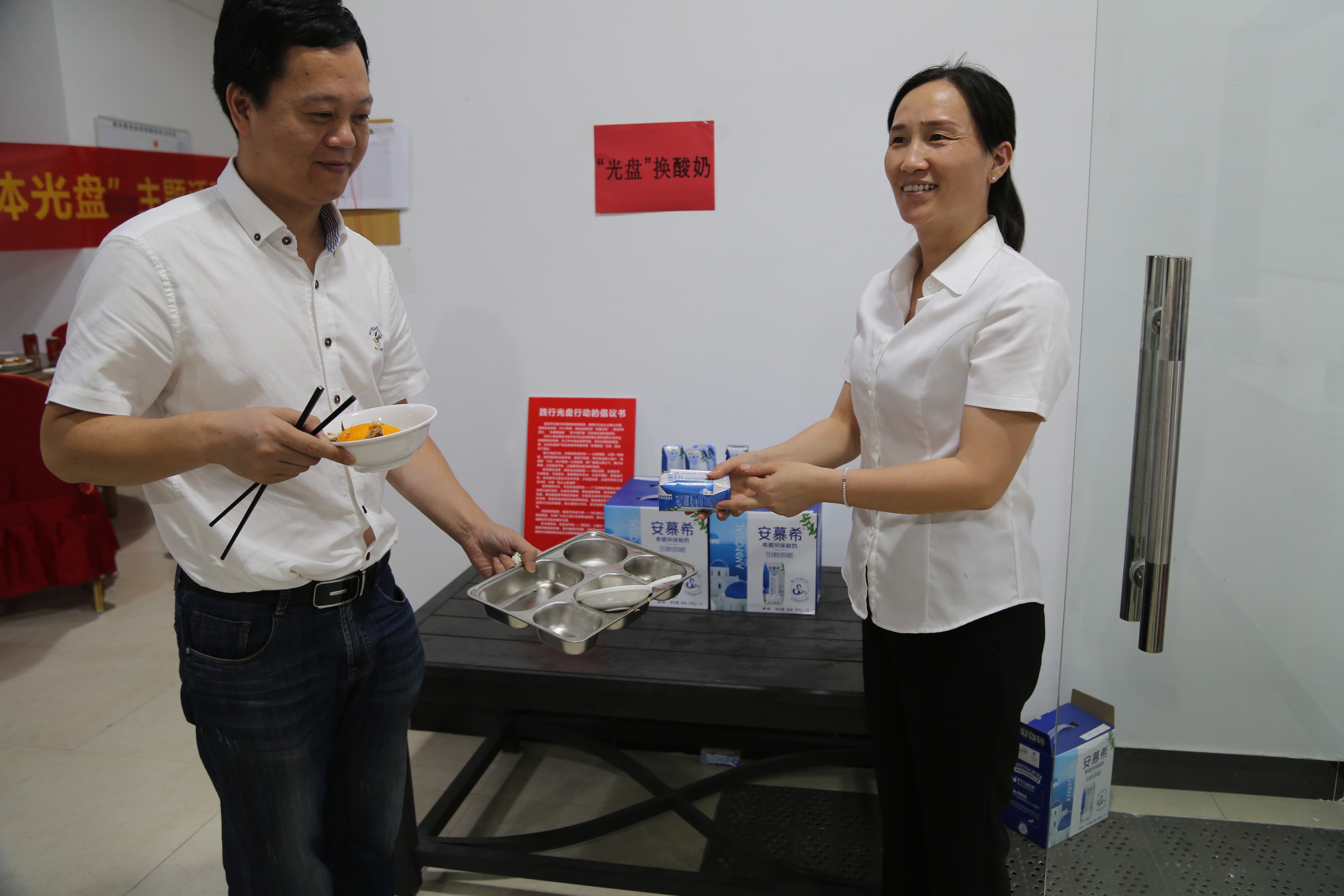 餐后,公司為倡導(dǎo)員工愛(ài)惜糧食,鼓勵(lì)員工積極光盤(pán),實(shí)行“光盤(pán)獎(jiǎng)勵(lì)”,每一位員工憑光盤(pán)可以兌換酸奶一瓶,借此小獎(jiǎng)勵(lì),倡導(dǎo)文明新風(fēng)尚,以“光盤(pán)”為榮,以“剩宴”為恥。 盧丹麗